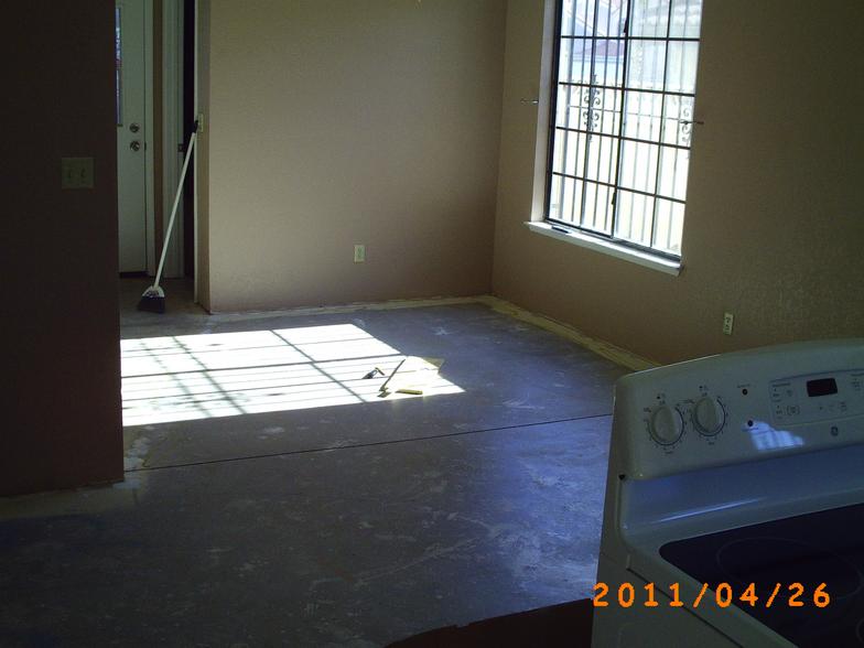 All the baseboards, flooring, window coverings, appliances, electrical plates were removed to make way for the new.